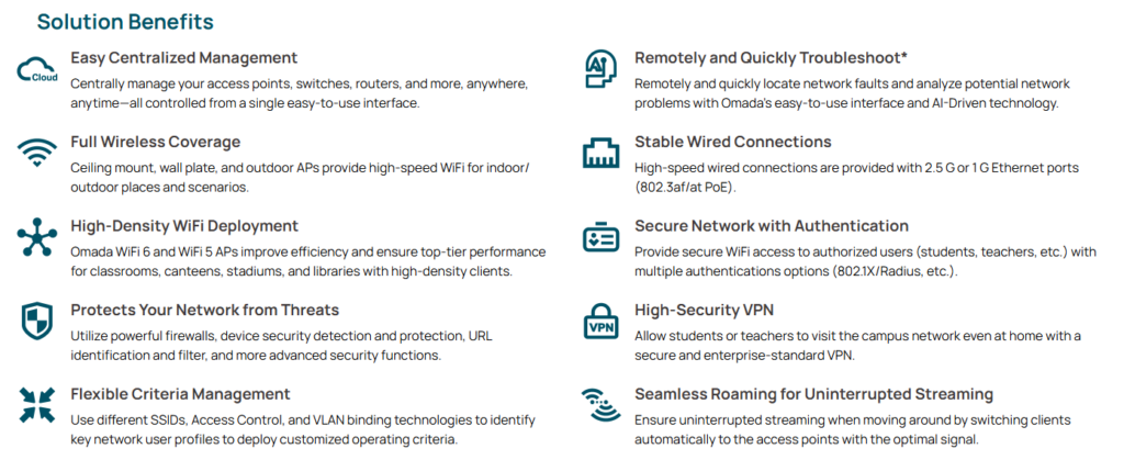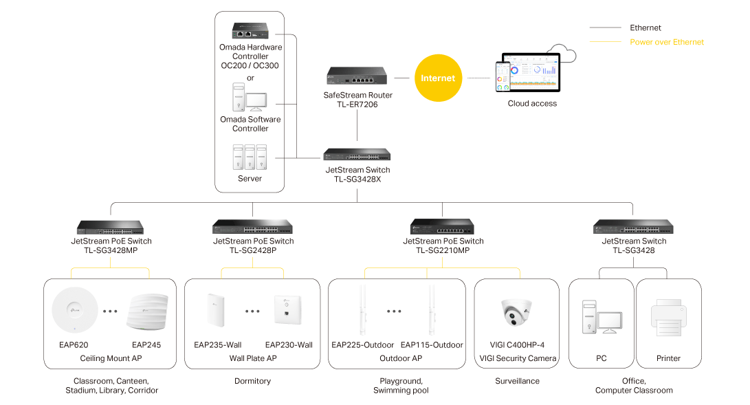 | Outdoor APs | EAP225-Outdoor | Playground, swimming pool | Long-range outdoor coverage; Dual-band 11AC WiFi with speeds of up to 1,200 Mbps; 1× Gigabit RJ45 port; Supports 802.3af and Passive PoE; Mesh; Seamless roaming; IP65 weatherproof enclosure |